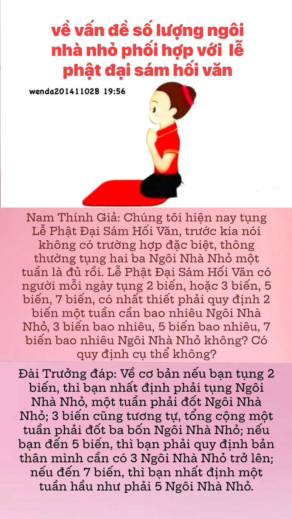 Đài Trưởng đáp: Về cơ bản nếu bạn tụng 2 biến, thì bạn nhất định phải tụng Ngôi Nhà Nhỏ, một tuần phải đốt Ngôi Nhà Nhỏ; 3 biến cũng tương tự, tổng cộng một tuần phải đốt ba bốn Ngôi Nhà Nhỏ; nếu bạn đến 5 biến, thì bạn phải quy định bản thân mình cần có 3 Ngôi Nhà Nhỏ trở lên; nếu đến 7 biến, thì bạn nhất định một tuần hầu như phải 5 Ngôi Nhà Nhỏ.