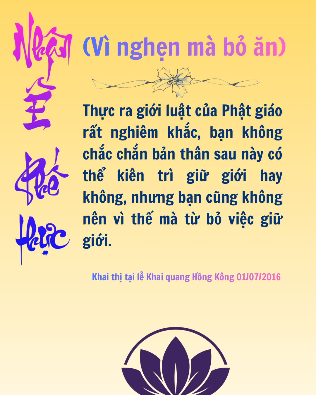 Thực ra giới luật của Phật giáo rất nghiêm khắc, bạn không chắc chắn bản thân sau này có thể kiên trì giữ giới hay không, nhưng bạn cũng không nên vì thế mà từ bỏ việc giữ giới. Tuy rằng bạn không đoán định được bản thân có thể thọ trì toàn bộ hay không —— thọ trì chính là "tôi có thể làm được" —— nhưng bạn cũng không thể từ bỏ, bởi vì như vậy sẽ dẫn đến việc bạn lưu chuyển sinh tử, chìm đắm trong lục đạo.