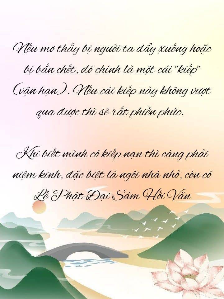 Nếu mơ thấy bị người ta đẩy xuống hoặc bị bắn chết, đó chính là một cái "kiếp" (vận hạn). Nếu cái kiếp này không vượt qua được thì sẽ rất phiền phức. Khi biết mình có kiếp nạn thì càng phải niệm kinh, đặc biệt là ngôi nhà nhỏ, còn có Lễ Phật Đại Sám Hối Văn