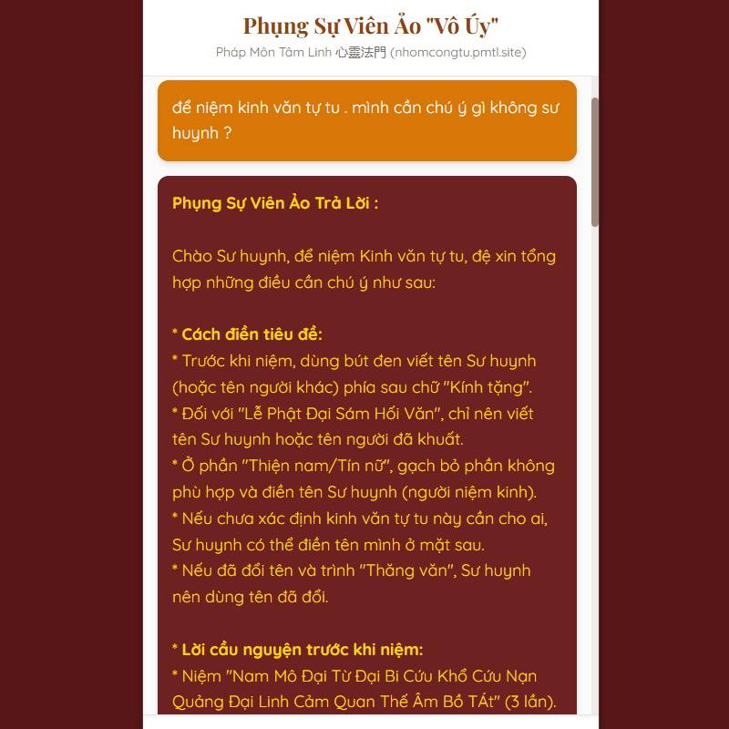 * Khấn: "Xin đại từ đại bi quan thế âm bồ tát bảo hộ, hiện tại Sư huynh XXX niệm kinh văn tự tu “YYY”, xin Quan Thế Âm Bồ Tát minh chứng."