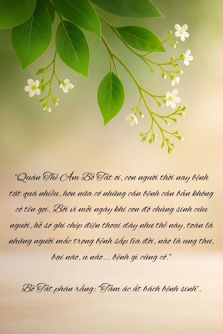 🪷Bồ Tát phán rằng: "Tâm ác ắt bách bệnh sinh". Một người mà lương tâm ác thì bệnh gì cũng có thể phát ra. Đừng nhìn mấy chữ này đơn giản, ngụ ý bên trong đặc biệt sâu sắc. Bạn hãy nhìn những người mắc ác bệnh mà xem, cho dù bạn nói rằng: "Mẹ của con mắc ác bệnh, nhưng mẹ con không làm việc xấu, lương tâm mẹ con rất tốt", thế nhưng một người kiếp này lương tâm tốt không có nghĩa là kiếp trước lương tâm cũng tốt.