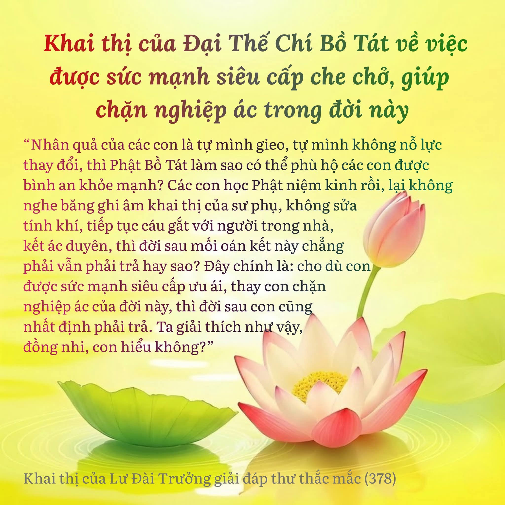 🪷Đại Thế Chí Bồ Tát: “Nhân quả của các con là tự mình gieo, tự mình không nỗ lực thay đổi, thì Phật Bồ Tát làm sao có thể phù hộ các con được bình an khỏe mạnh? Các con học Phật niệm kinh rồi, lại không nghe băng ghi âm khai thị của sư phụ, không sửa tính khí, tiếp tục cáu gắt với người trong nhà, kết ác duyên, thì đời sau mối oán kết này chẳng phải vẫn phải trả hay sao? Đây chính là: cho dù con được sức mạnh siêu cấp ưu ái, thay con chặn nghiệp ác của đời này, thì đời sau con cũng nhất định phải trả. Ta giải thích như vậy, đồng nhi, con hiểu không?”