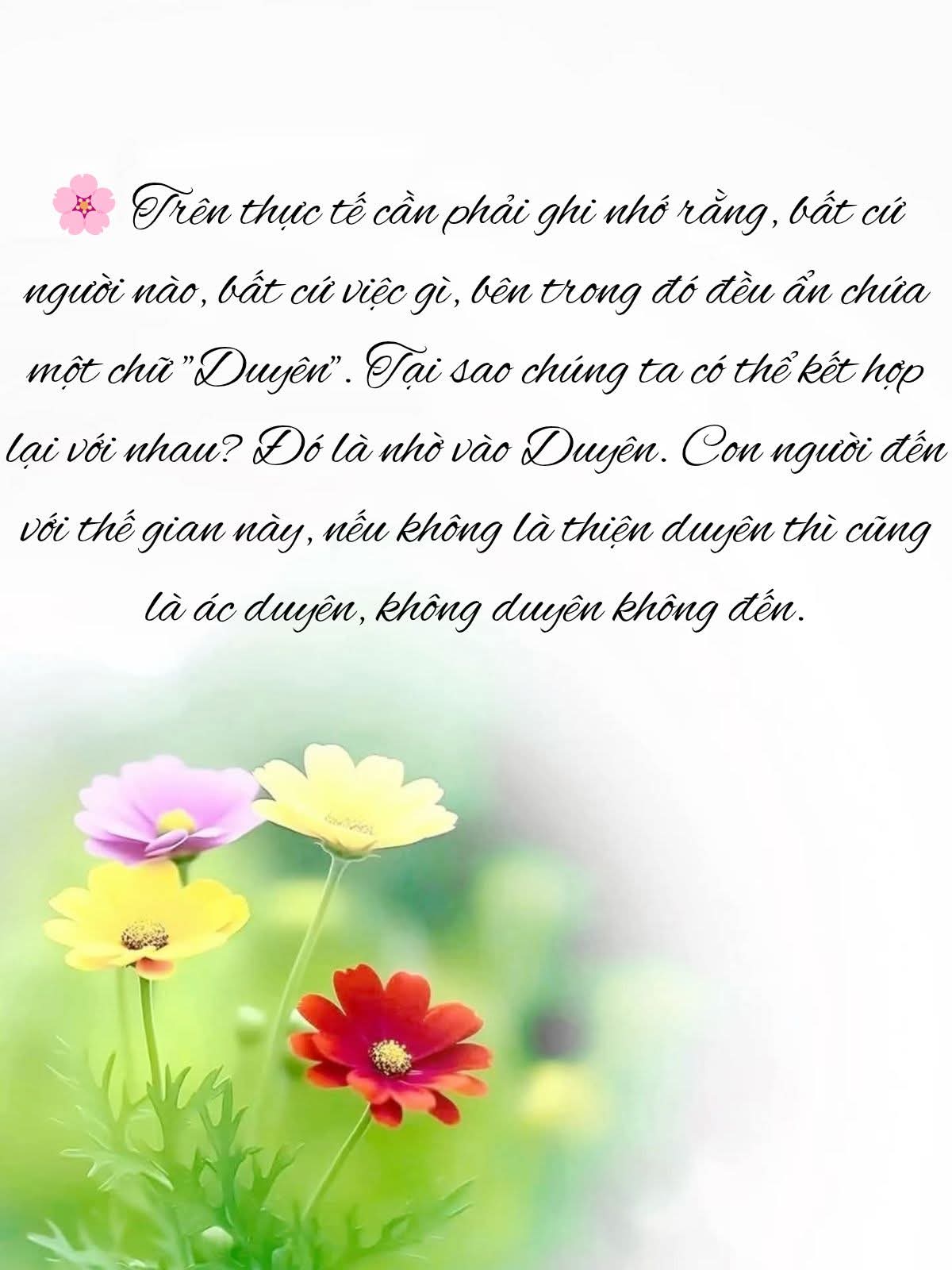 🌸 Trên thực tế cần phải ghi nhớ rằng, bất cứ người nào, bất cứ việc gì, bên trong đó đều ẩn chứa một chữ "Duyên". Tại sao chúng ta có thể kết hợp lại với nhau? Đó là nhờ vào Duyên. Con người đến với thế gian này, nếu không là thiện duyên thì cũng là ác duyên, không duyên không đến.
