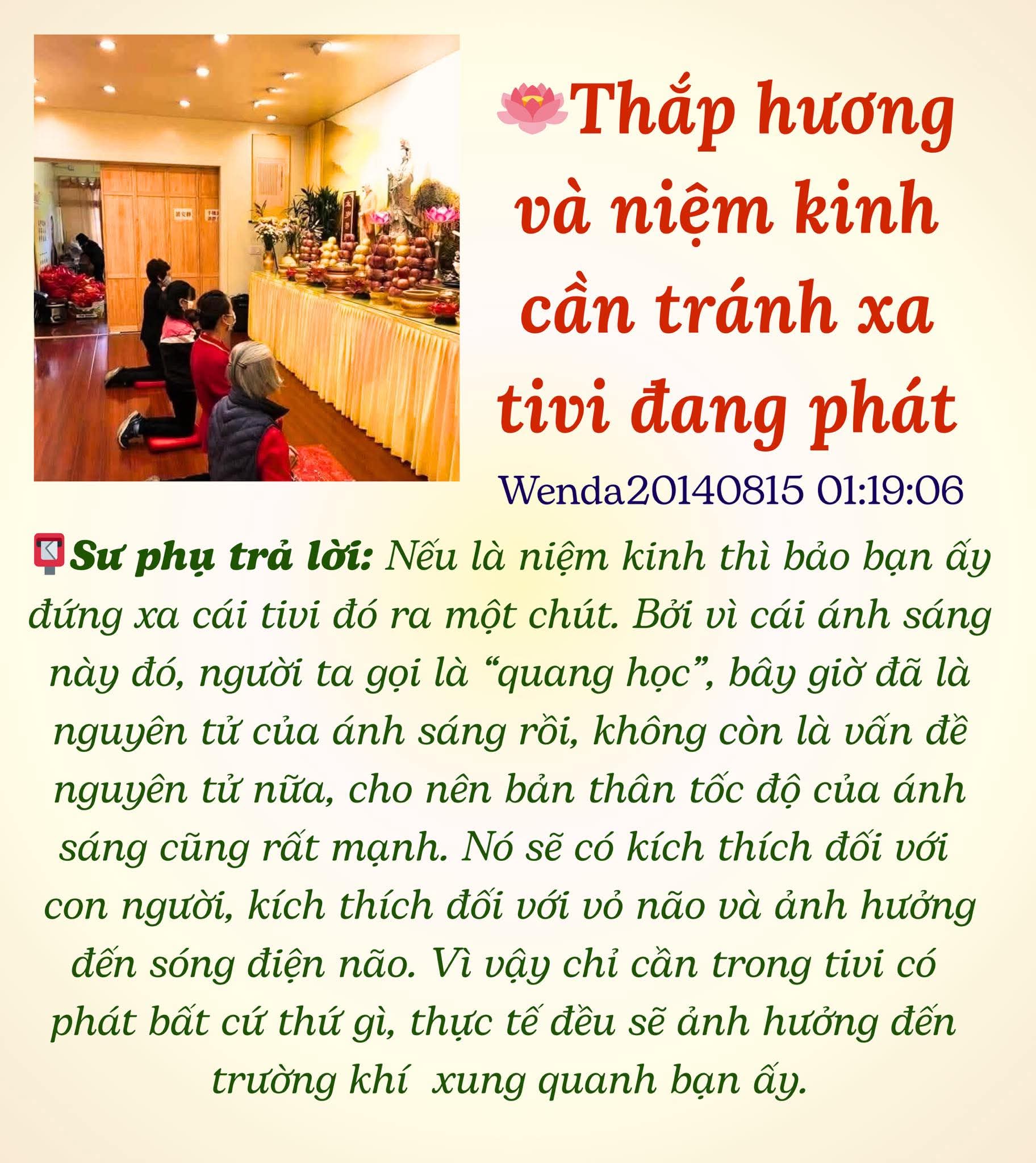 Sư phụ trả lời: Nếu là niệm kinh thì bảo bạn ấy đứng xa cái tivi đó ra một chút. Bởi vì cái ánh sáng này đó, người ta gọi là “quang học”, bây giờ đã là nguyên tử của ánh sáng rồi, không còn là vấn đề nguyên tử nữa, cho nên bản thân tốc độ của ánh sáng cũng rất mạnh. Nó sẽ có kích thích đối với con người, kích thích đối với vỏ não và ảnh hưởng đến sóng điện não. Vì vậy chỉ cần trong tivi có phát bất cứ thứ gì, thực tế đều sẽ ảnh hưởng đến khí trường xung quanh bạn ấy.