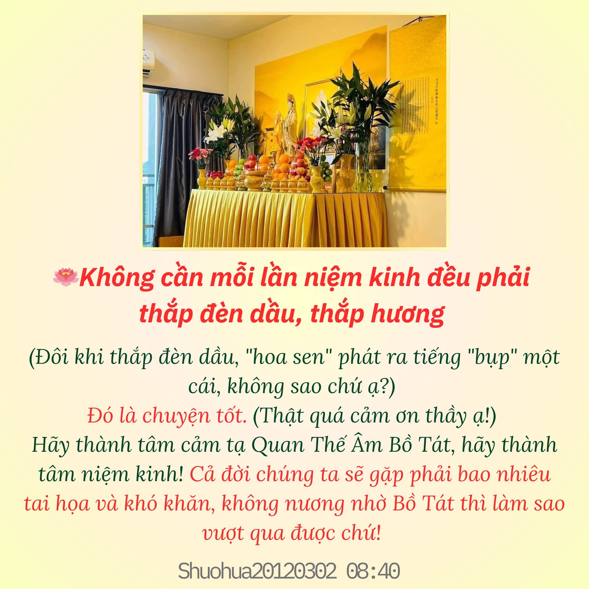 (Ví dụ như con niệm xong kinh bài tập của mình, rồi niệm cho con nhỏ hoặc cho cha, thì trước khi niệm, trong lòng thưa với Quan Thế Âm Bồ Tát rằng, những bài kinh tiếp theo là niệm cho người nào đó phải không ạ?) Đúng vậy. (Rồi đến tối mới thắp đèn dầu, thắp hương ạ?)