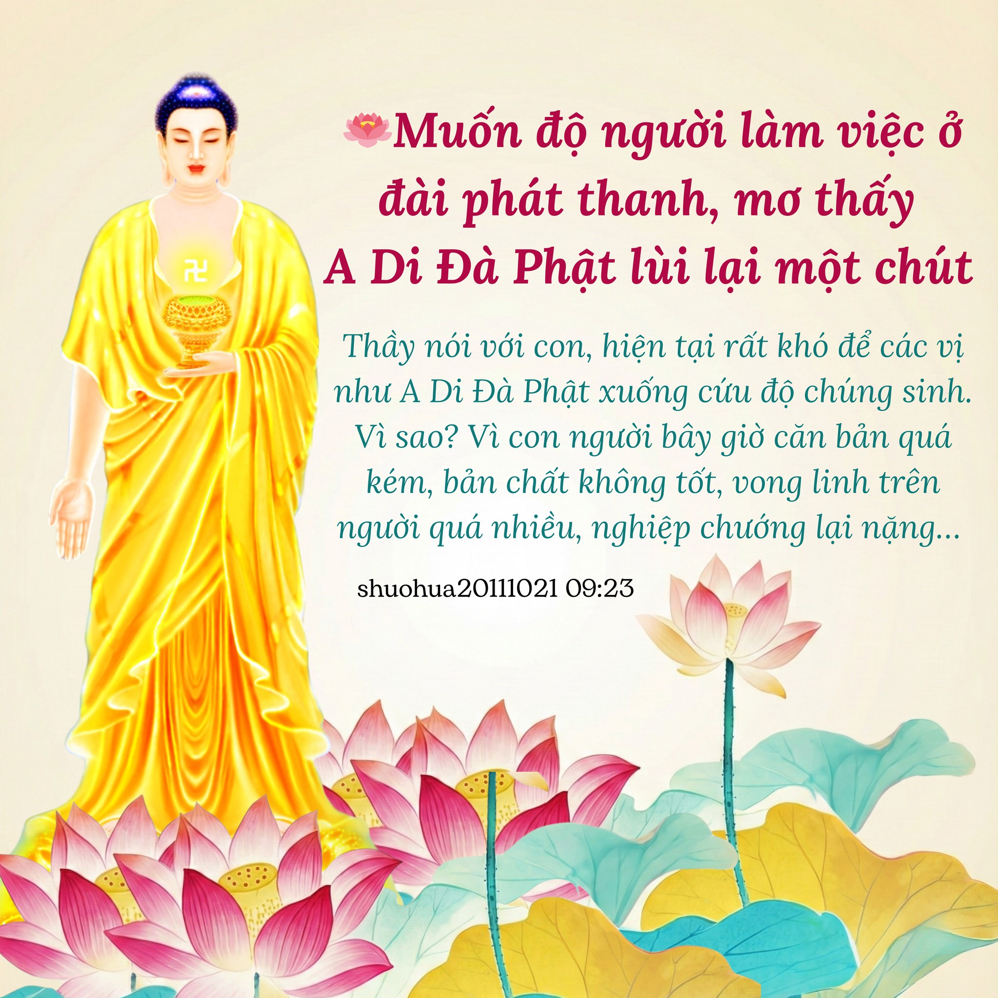 Thính giả nữ: Con muốn thực hiện một việc ở địa phương, đó là đưa một đĩa DVD cho một người làm việc tại đài phát thanh, để họ xem liệu có thể phát sóng ở đây hay không. Con đã trình bày việc này trước bàn thờ Phật, và tối hôm đó con mơ thấy mình nhặt được một chiếc ví, bên trong có một chiếc thẻ. Trên thẻ có hình Quán Thế Âm Bồ Tát và A Di Đà Phật. Dưới hình A Di Đà Phật có viết chữ luân hồi và Đức Phật, phía sau còn vài chữ nữa nhưng con không nhớ rõ. Sau đó, A Di Đà Phật lùi lại một chút. Giấc mơ này có phải biểu thị rằng việc này có chút trở ngại không? Sư phụ đáp: A Di Đà Phật lùi lại một chút, đúng không? Điều này cho thấy con có duyên rất sâu với Tây Phương Tam Thánh (Ồ, đây là lần đầu tiên con mơ thấy như vậy). Lần đầu tiên mơ thấy đều là thật. Thầy nói với con, hiện tại rất khó để các vị như A Di Đà Phật xuống cứu độ chúng sinh. Vì sao? Vì con người bây giờ căn bản quá kém, bản chất không tốt, vong linh trên người quá nhiều, nghiệp chướng lại nặng. A Di Đà Phật muốn cứu họ cũng không thể, nên chỉ có thể lùi lại! Con nghĩ mà xem, ai cũng muốn đến Tây Phương Cực Lạc, nhưng những người đến đây, phẩm chất không đủ, không ai đạt tiêu chuẩn. Con nói xem, Bồ Tát có buồn không? (Dạ đúng, lùi lại thật ạ!) Con thử nghĩ, ai cũng muốn thi đỗ đại học, hiệu trưởng rất hoan nghênh, nhưng khi xem điểm thi thì không ai đạt yêu cầu, hiệu trưởng chỉ có thể lùi lại thôi! (Ồ) Hiện tại vì sao Quán Thế Âm Bồ Tát xuống độ chúng sinh? Vì Ngài muốn chúng ta nâng cao thành tích, xóa bỏ nghiệp chướng và vong linh trên người. Khi đó, chúng ta mới đạt được cảnh giới của A Di Đà Phật, đúng không? (Dạ, con đã hiểu). 🪷Giải Thích của Thầy Lư Nhân Dịp Đản Sanh A Di Đà Phật
