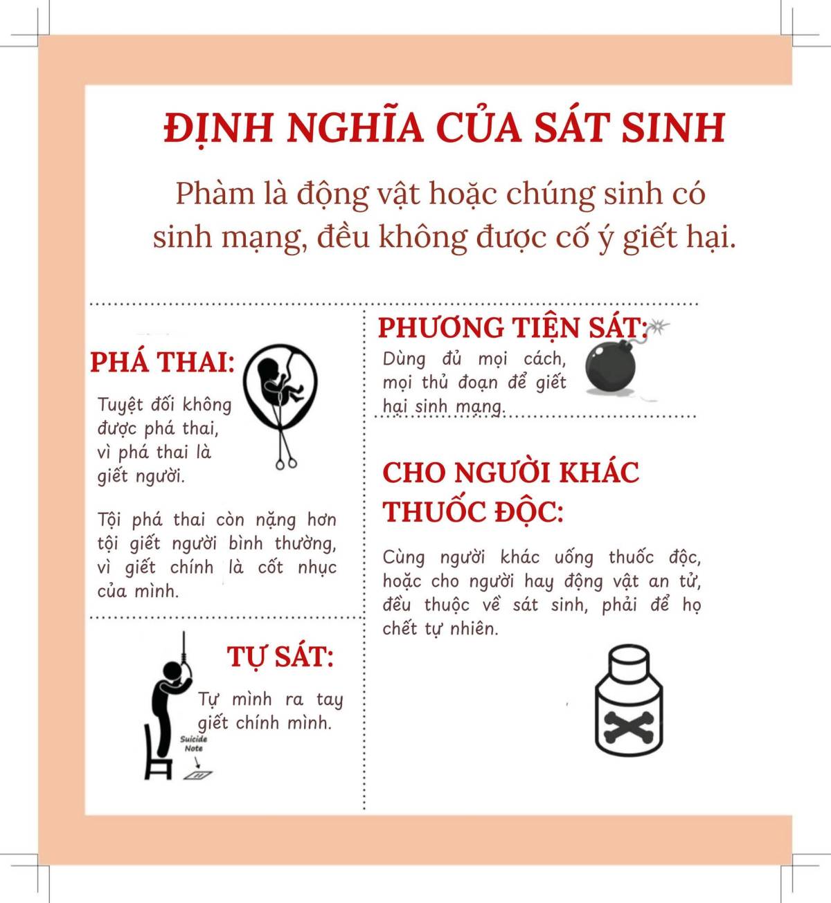 Nếu tự sát, bảo người khác giết, dùng phương tiện để giết, dùng chú để giết, phá thai, phá trứng, cho người khác thuốc độc, khiến sinh mạng bị đoạn dứt, đều mắc tội sát sinh.