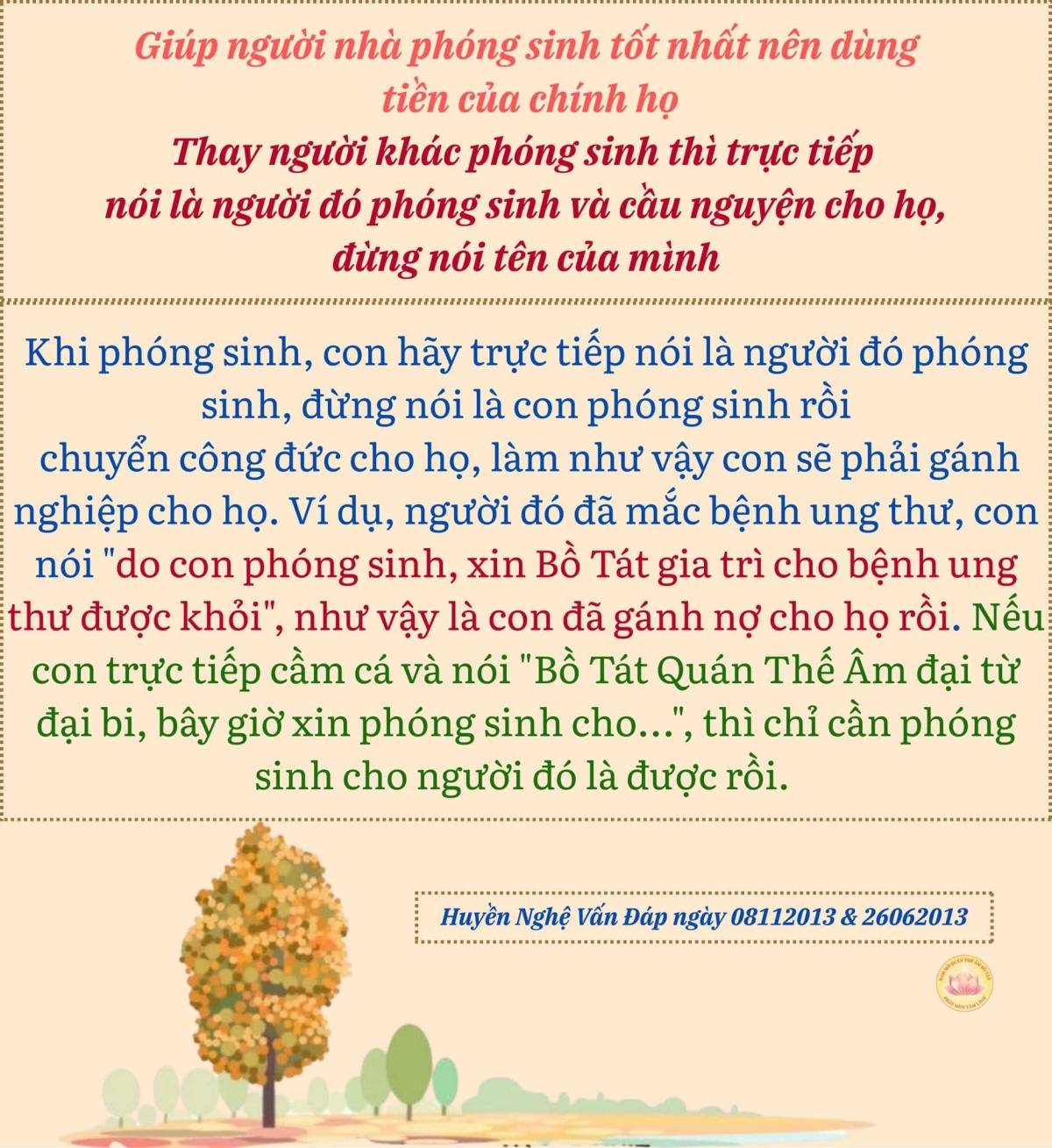 🔻Sư phụ: Khi phóng sinh, con hãy trực tiếp nói là người đó phóng sinh, đừng nói là con phóng sinh rồi chuyển công đức cho họ, làm như vậy con sẽ phải gánh nghiệp cho họ. Ví dụ, người đó đã mắc bệnh ung thư, con nói "do con phóng sinh, xin Bồ Tát gia trì cho bệnh ung thư được khỏi", như vậy là con đã gánh nợ cho họ rồi. Nếu con trực tiếp cầm cá và nói "Bồ Tát Quán Thế Âm đại từ đại bi, bây giờ xin phóng sinh cho...", thì chỉ cần phóng sinh cho người đó là được rồi.