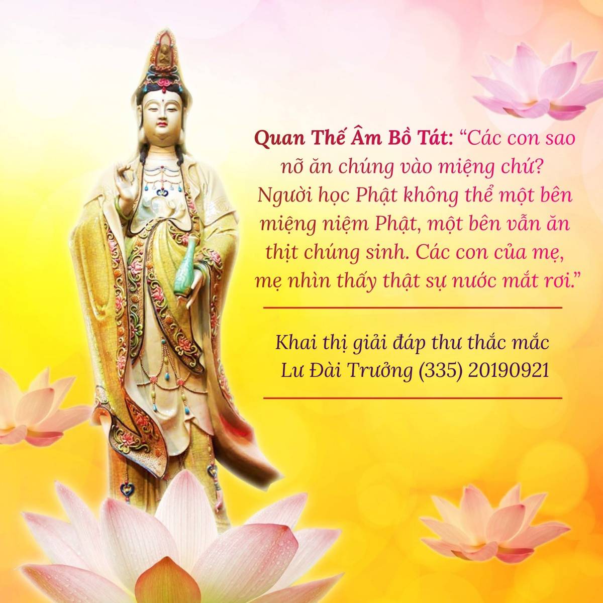 Quan Thế Âm Bồ Tát: “Các con sao nỡ ăn chúng vào miệng chứ? Người học Phật không thể một bên miệng niệm Phật, một bên vẫn ăn thịt chúng sinh. Các con của mẹ, mẹ nhìn thấy thật sự nước mắt rơi.”
